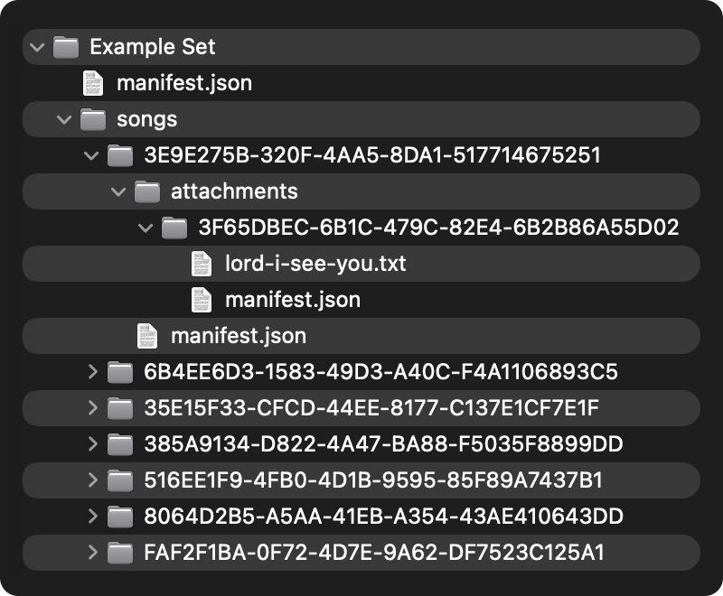 Taking that knowledge means that our OnSong® Binder file can contain a single root object, or could contain a collection of objects. For instance, if you are sending a set list of songs, you could include a “manifest.json” file at the root that contains information about the set. You could then include a “songs” folder that references objects contained in the setlist’s songs collection, and then each object would be a folder therein like this…